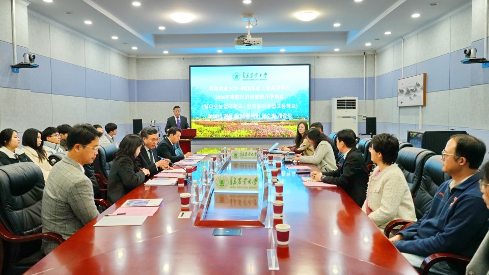 12月30日,青岛农业大学-韩国东亚工业高等学校2026年寒假汉语研修班开学典礼在专家楼会议室举行。青岛农业大学党委委员、副校长王永健,韩国东亚工业高等学校校长李京焕出席了开学典礼,典礼由国际教育学院党总支书记张兴华主持。