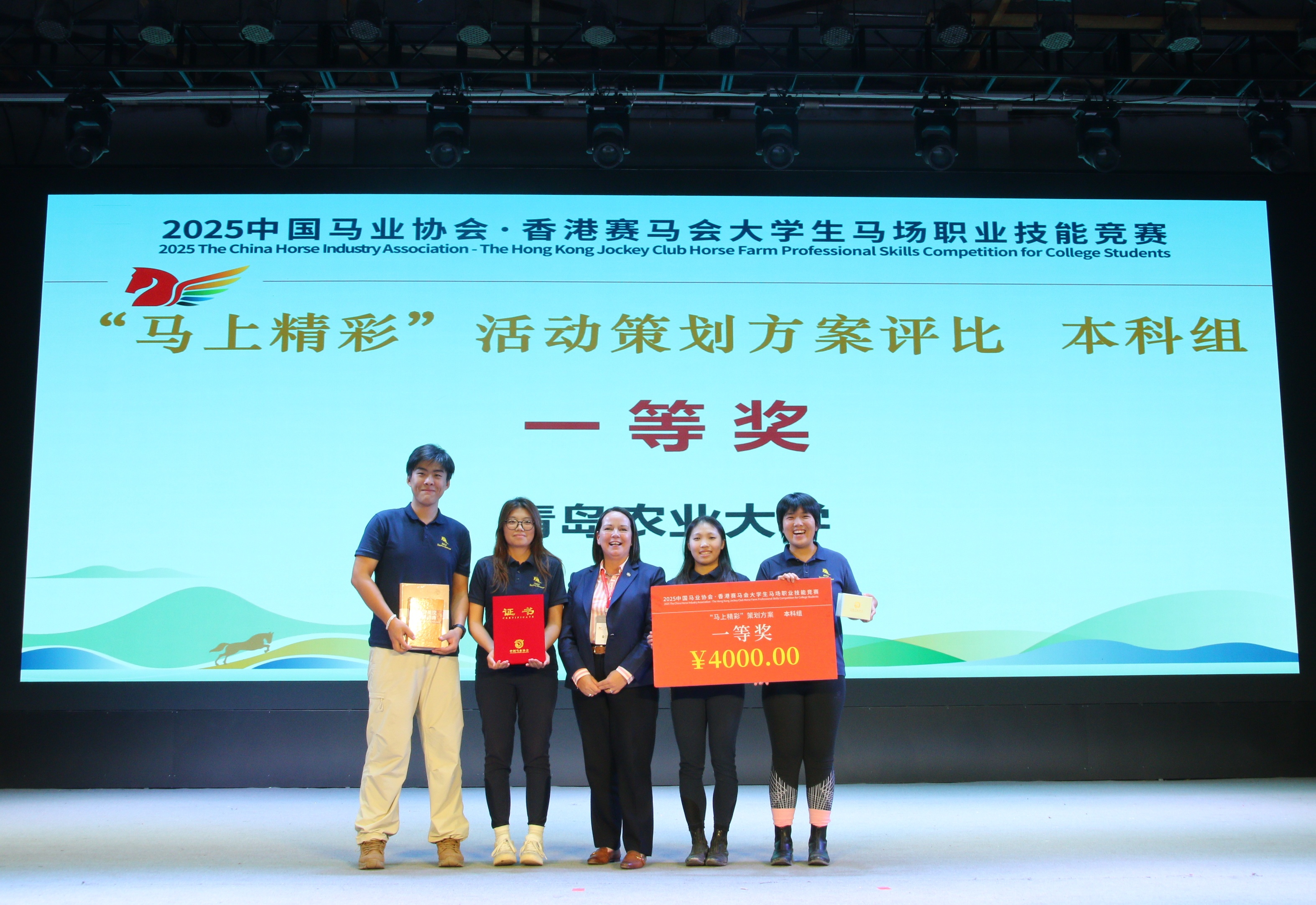 学院代表队由申北辰、马雨昕、利小将、李沂蔓四名马业科学专业学生组成,在激烈的竞赛中,荣获本科组团体一等奖、“马上精彩”策划方案评比一等奖。马雨昕荣获本科组个人二等奖,申北辰、利小将荣获本科组优秀奖。参赛队伍由孟元、王敏、特聘教授凯瑟琳等教师指导,指导老师孟元荣获优秀指导教师荣誉称号。