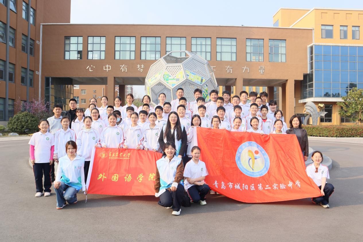 4月1日,外国语学院走进城阳区第二实验中学开展“向阳计划——语润农耕译传情,农遗双语润青春”进课堂活动,用双语传播农耕文化。