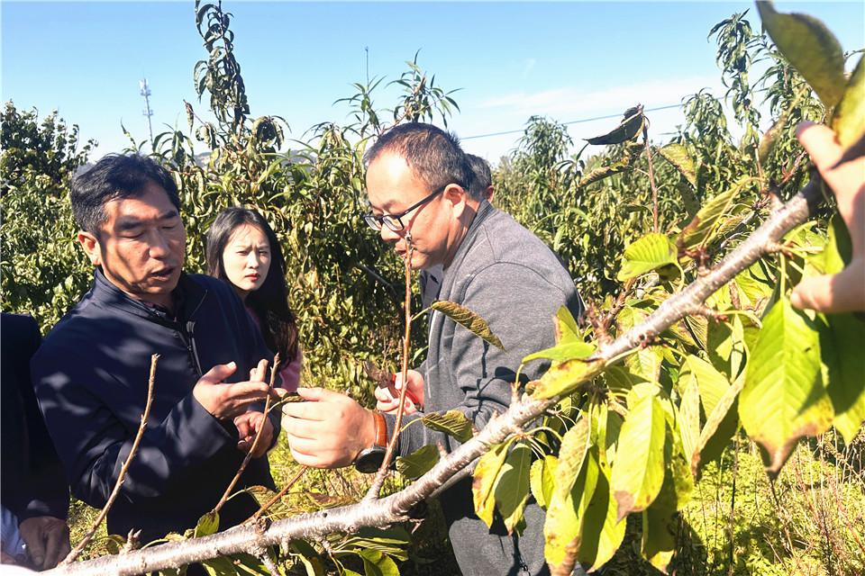 2025年10月22日,屈海泳教授在青岛市西海岸新区灵珠山街道刘家庄社区讲解大樱桃栽培。