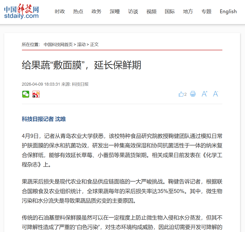 【编者按】4月10日,中国科技网以《给果蔬“敷面膜”,延长保鲜期》以题,报道了青岛农业大学特种食品研究院教授鞠健团队发出一种集高效保湿和协同抗菌活性于一体的纳米复合保鲜纸,能够有效延长草莓、小番茄等果蔬货架期。