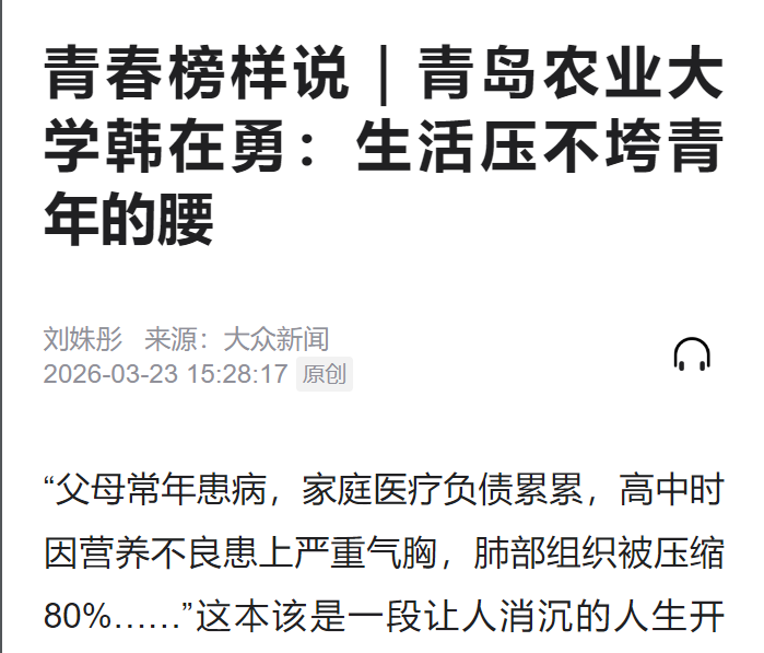 【编者按】3月23日,大众新闻以《青春榜样说|青岛农业大学韩在勇:生活压不垮青年的腰》为标题,报道了青岛农业大学动物医学专业韩在勇同学从逆境中逆袭成长,不忘初心,勇攀高峰。
