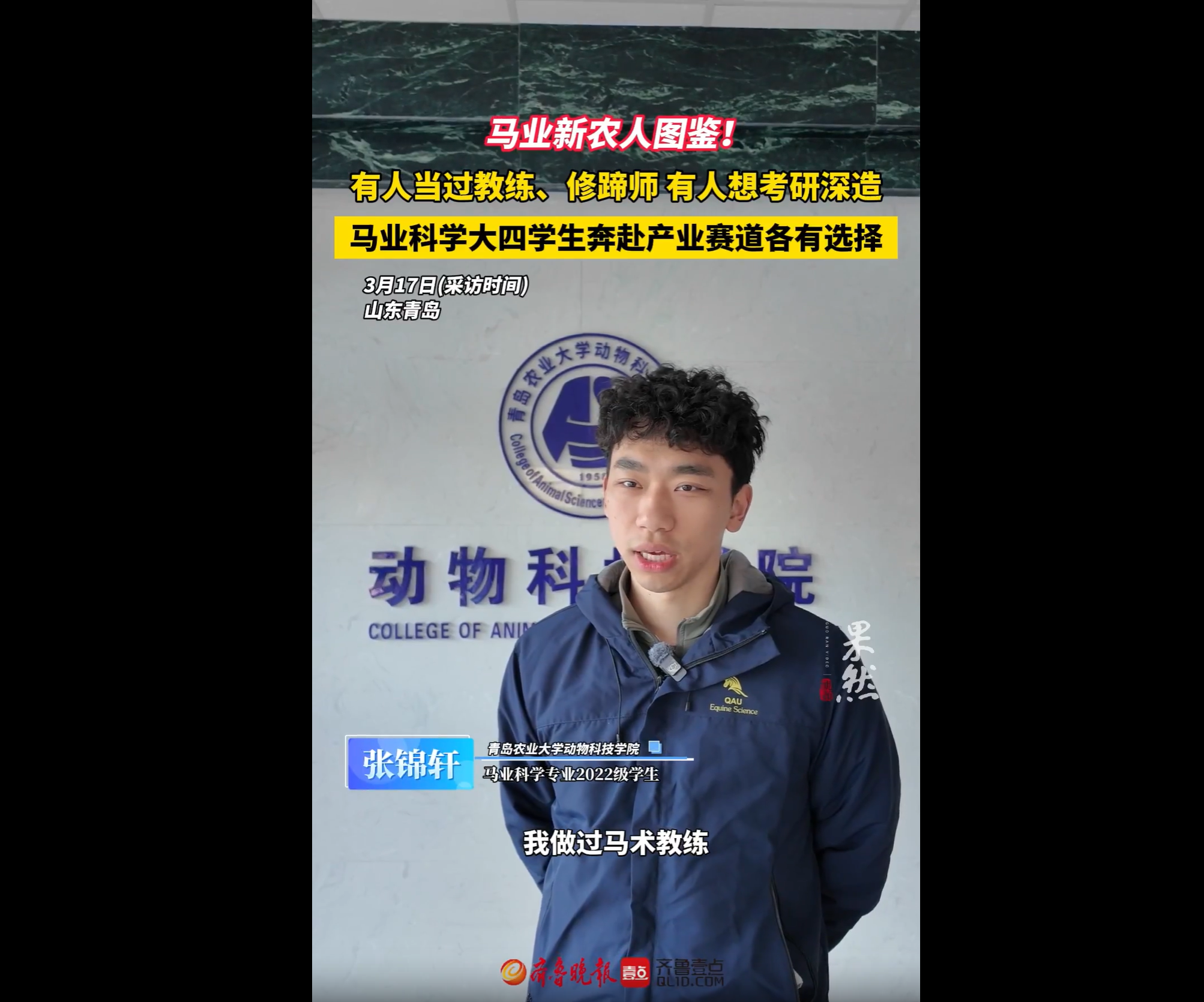 【编者按】3月19日,大众报业·齐鲁壹点、齐鲁晚报青岛融媒报道了青岛农业大学马业科学学院学生在与马相伴的时光里完成成长蜕变,成为驰骋在现代马业赛道上的新一代“新农人”。