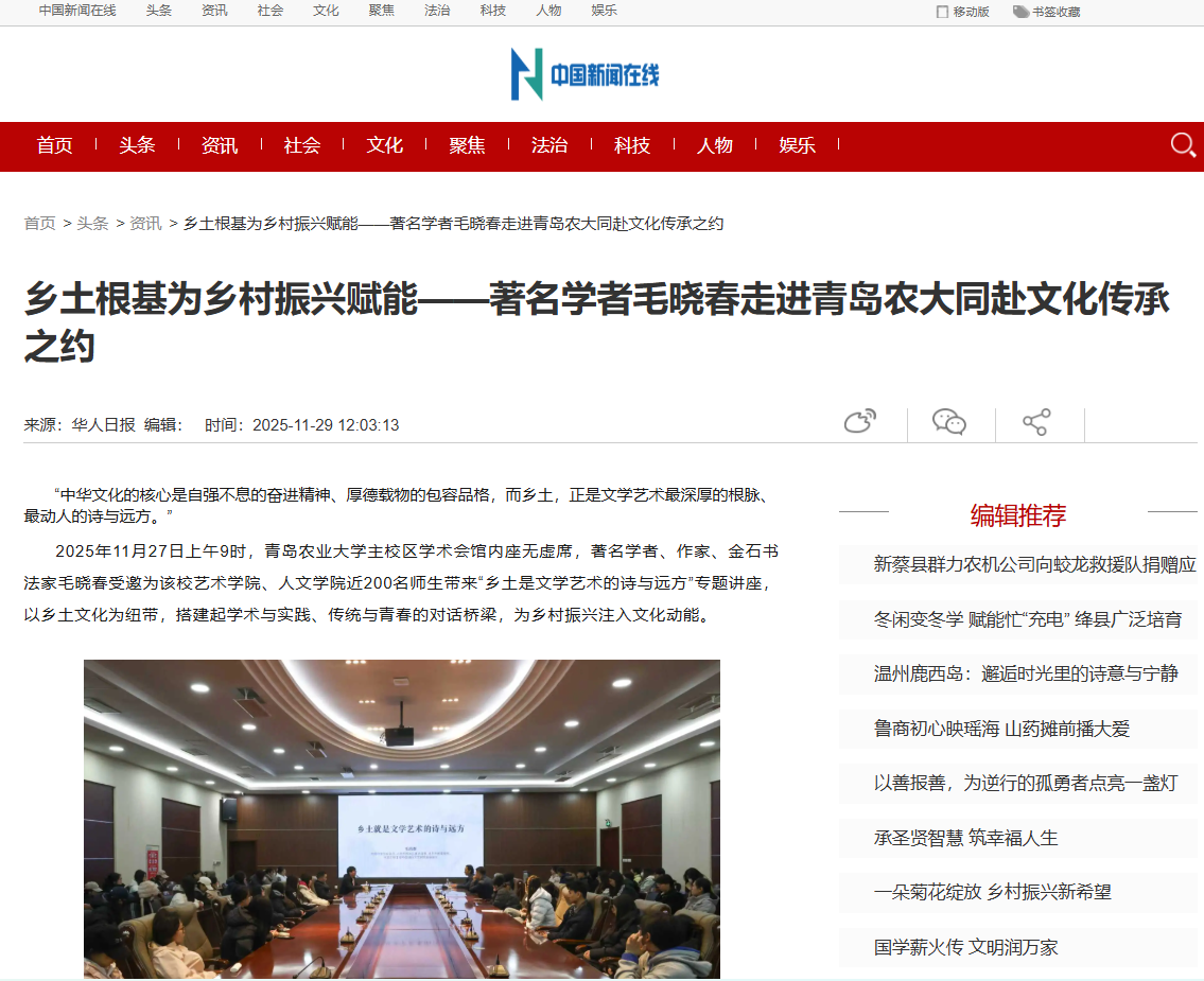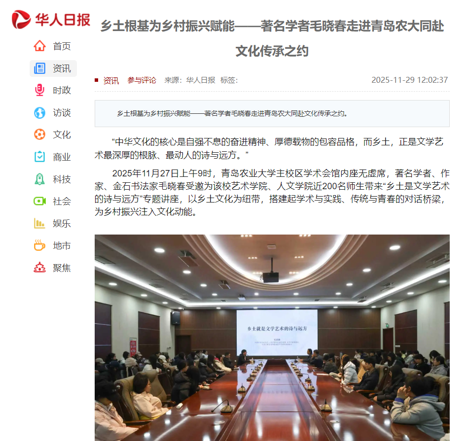 【编者按】11月28日,央视网、农民日报、中国农网、华人日报网、中国新闻在线、中国资讯网以《乡土根基为乡村振兴赋能 ——著名学者毛晓春走进青岛农大同赴文化传承之约》为题,报道青岛农业大学邀请著名学者毛晓春作“乡土是文学艺术的诗与远方”专题讲座。
