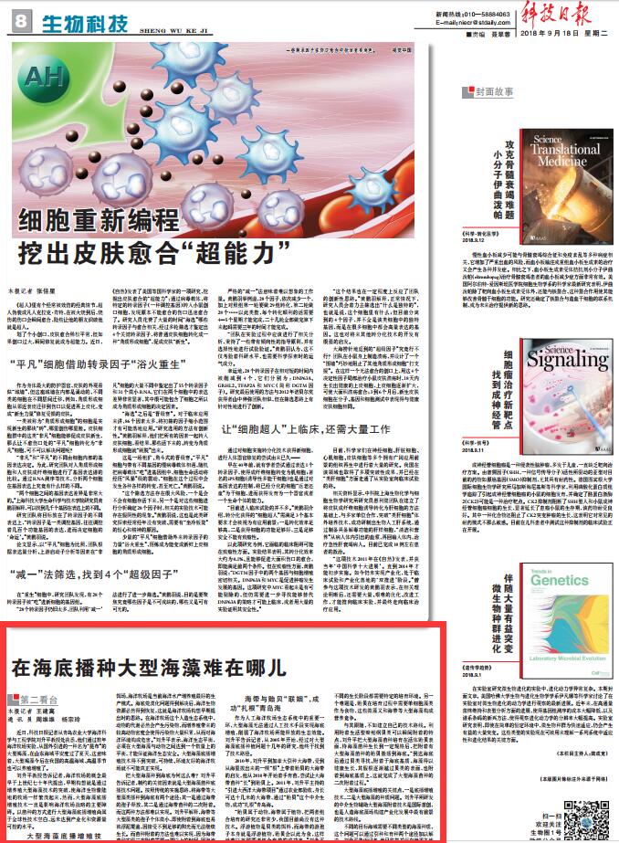 把大型海藻种到海底为何这么难?刘升平告诉记者,制约的关键因素就是大型海藻苗种底播技术问题。按照传统的实施思路,将海带等大型藻类播种到海底有两个途径:其一是通过海带的孢子释放,其二是通过海带苗种的二次附着。而这两种方法都难以实现。刘升平解释,海带等大型藻类的孢子个体微小,即使附着到海底也易被浮泥覆盖,因接受不到足够的阳光而无法继续生长。而苗种附着的方法也难以实现,因为海带苗种实现二次附着需要一周以上的时间,因海流等环境原因,海底的幼苗难以稳定地固定在特定地点,所以难以实现二次附着。