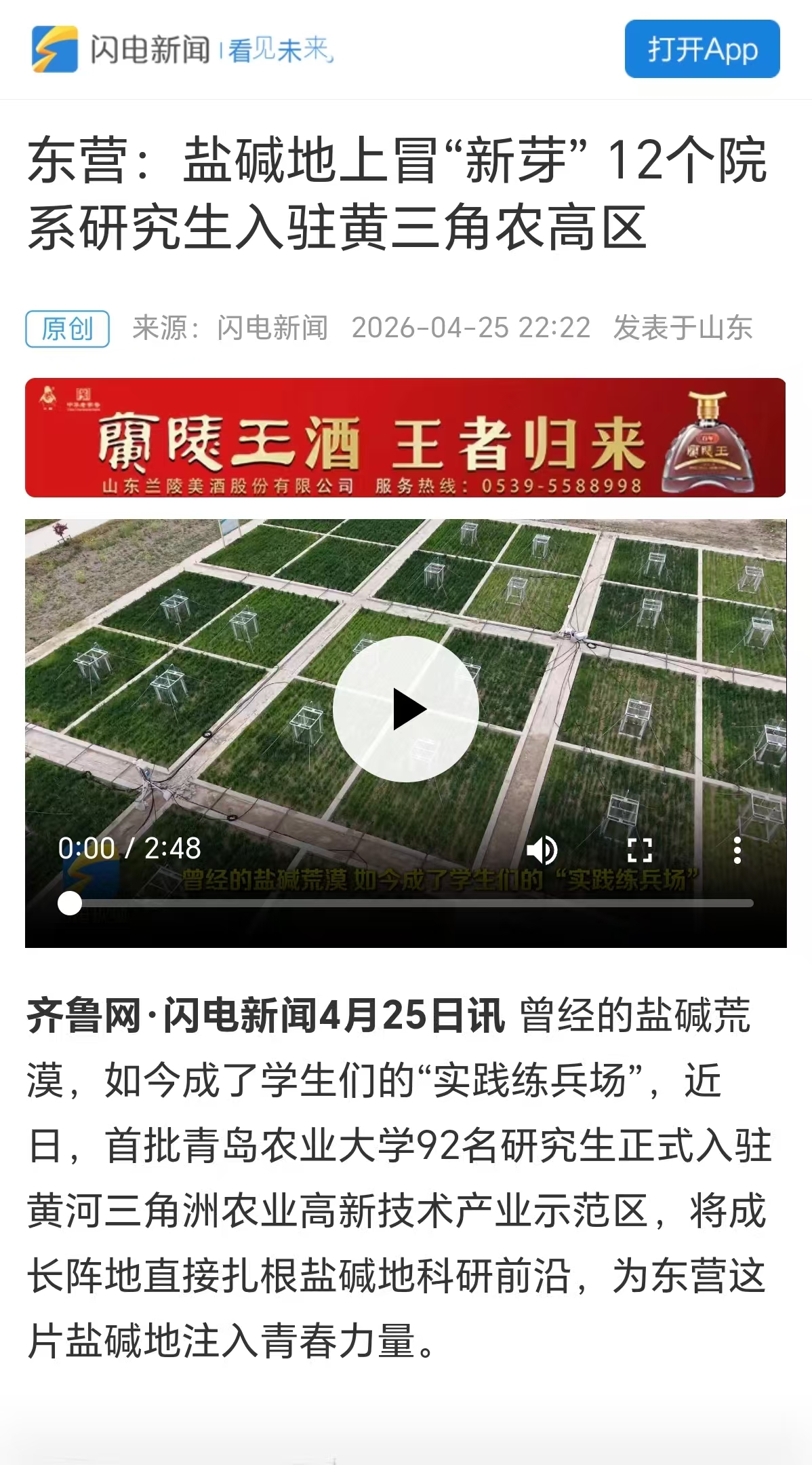 【编者按】4月25日,闪电新闻分别以《东营:盐碱地里冒“新芽” 青春力量赋新田》《东营:盐磁地上冒“新芽”12个院系研究生入驻 黄三角农高区》为题,报道了青岛农业大学92名研究生入驻黄河三角洲农业高新技术产业示范区,为东营这片盐碱地注入青春力量。