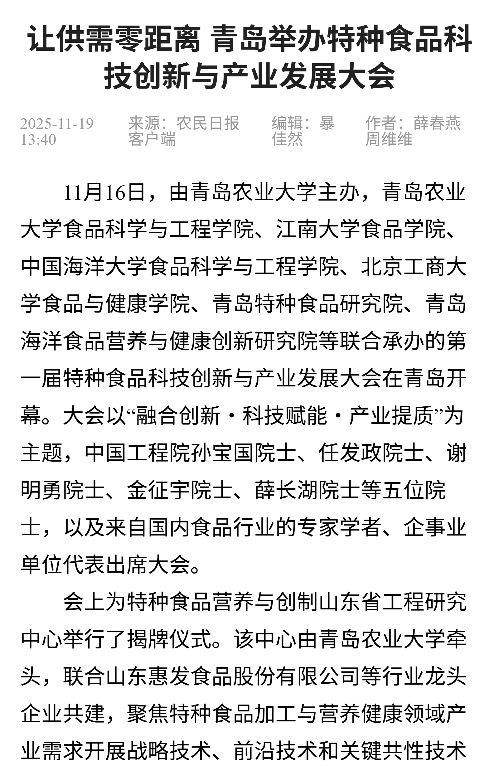 众新闻·大众日报:青岛农业大学举办第一届特种食品科技创新与产业发展大会