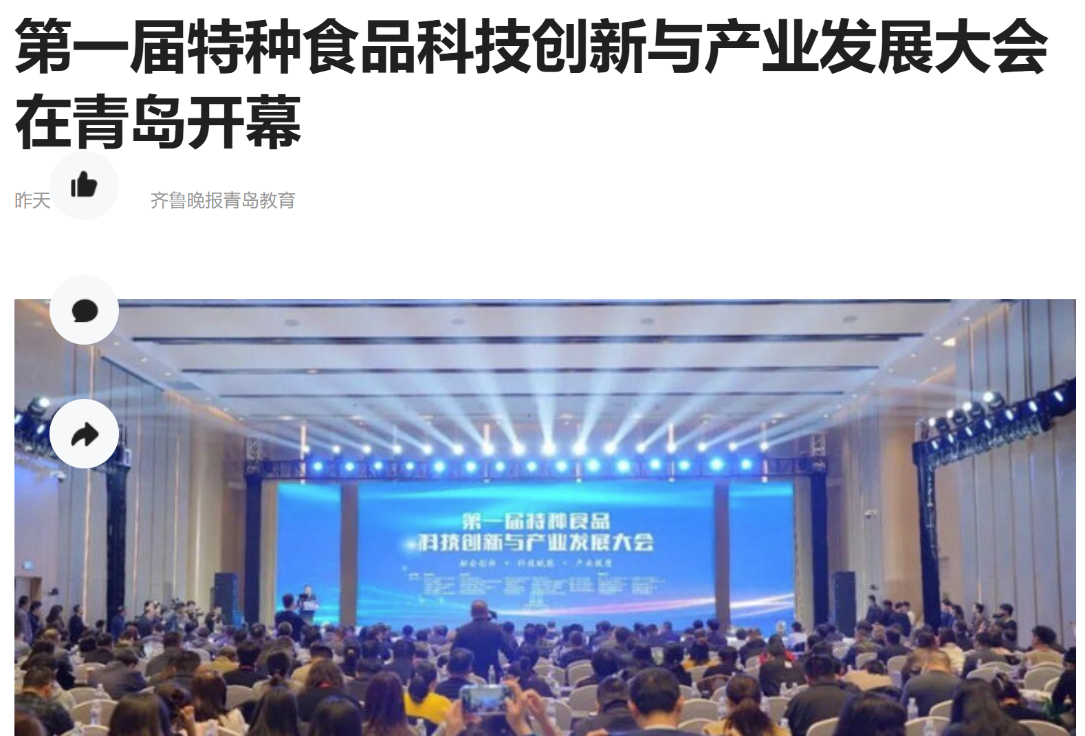 齐鲁晚报《第一届特种食品科技创新与产业发展大会在青岛开幕》