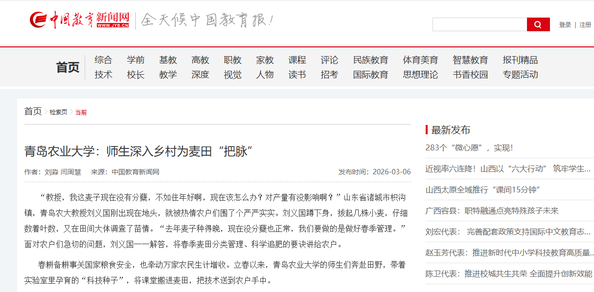 【编者按】3月9日,中国教育新闻网以“青岛农业大学:师生深入乡村为麦田'把脉'”为题报道青岛农业大学师生们自立春以来服务春耕备耕,怀揣把论文写在大地上的初心,将课堂搬进麦田,把技术送到农户手中,在广袤田野写下青农智慧与担当。