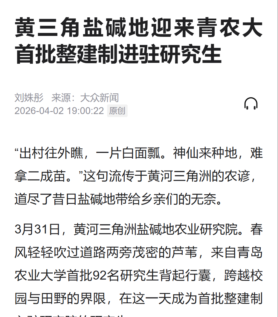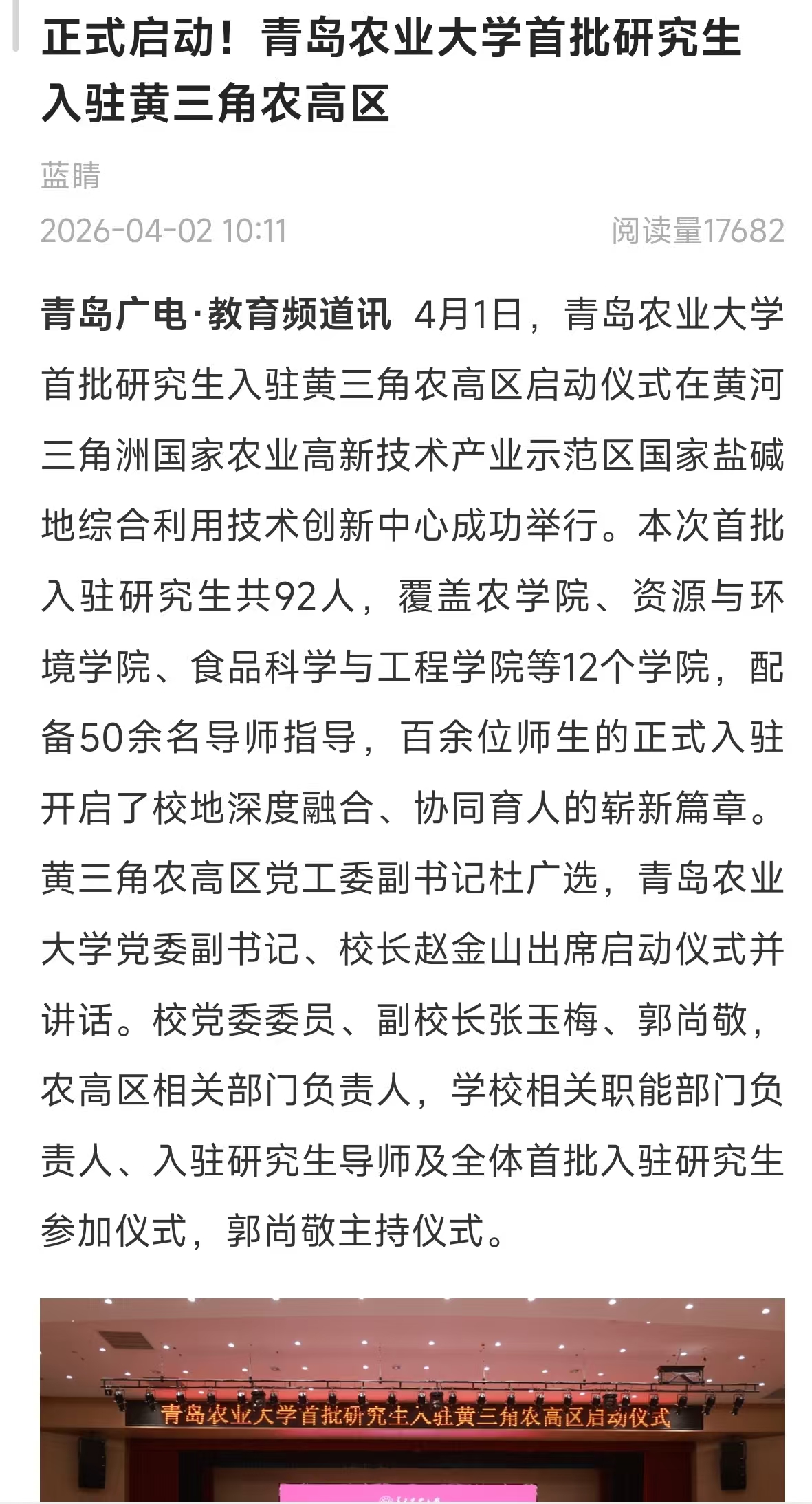“我们将研究生培养的前沿阵地部署到这里,就是要用我们的智慧和汗水,聚焦盐碱地综合利用这一核心使命,破解盐碱地改良利用关键难题,培育更多适配本土的优质品种。这既是学校的专业所长,更是我们义不容辞的时代责任。”4月1日,青岛农业大学首批研究生入驻黄三角农高区启动仪式上,青岛农业大学党委副书记、校长赵金山说。