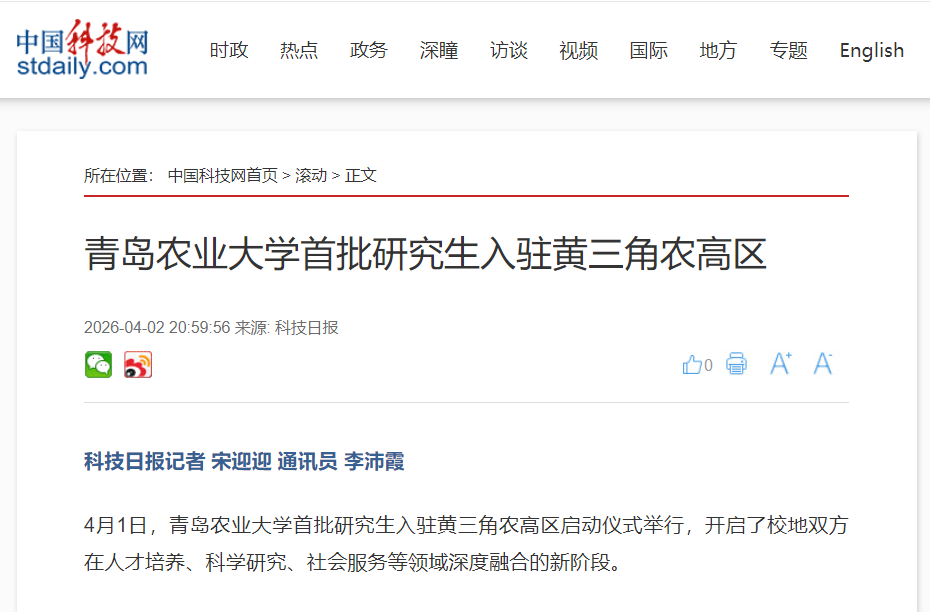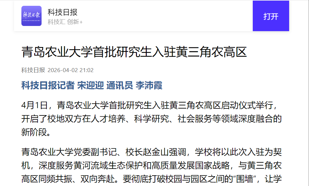 【编者按】4月2号,科技日报、中国科技网、中国青年报、大众新闻、青岛广电、爱东营、东营日报、微观东营报道青岛农业大学首批研究生入驻黄河三角洲国家农业高新技术产业示范区,将科研课堂搬到盐碱地一线。