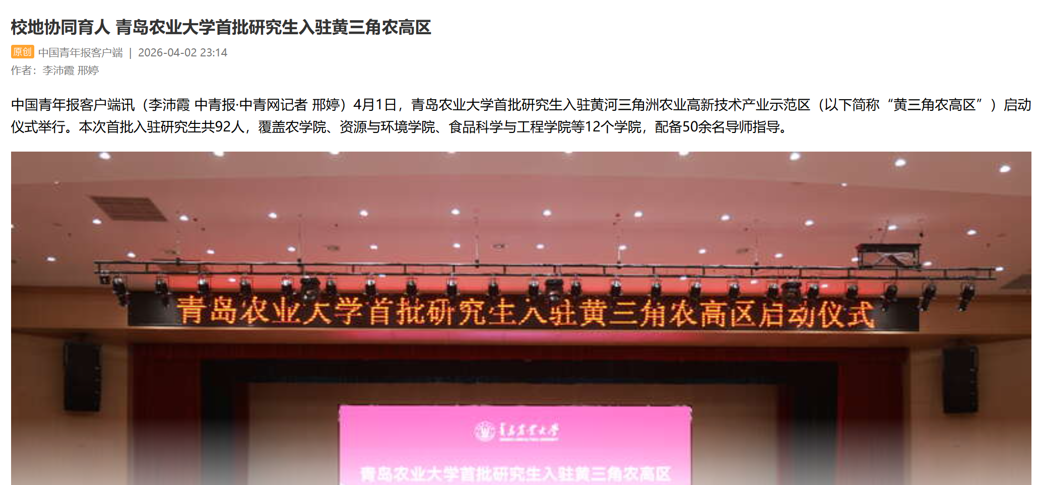 4月1日,青岛农业大学首批研究生入驻黄三角农高区启动仪式举行,开启了校地双方在人才培养、科学研究、社会服务等领域深度融合的新阶段。