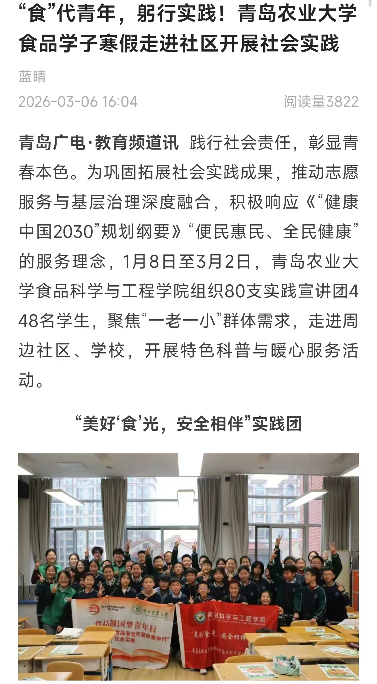 【编者按】3 月 6 日,青岛广电教育频道以《“食” 代青年,躬行实践!青岛农业大学食品学子寒假走进社区开展社会实践》为题报道了青岛农业大学食品科学与工程学院组织80支实践宣讲团448名学生,聚焦“一老一小”群体需求,走进周边社区、学校,开展特色科普与暖心服务活动。