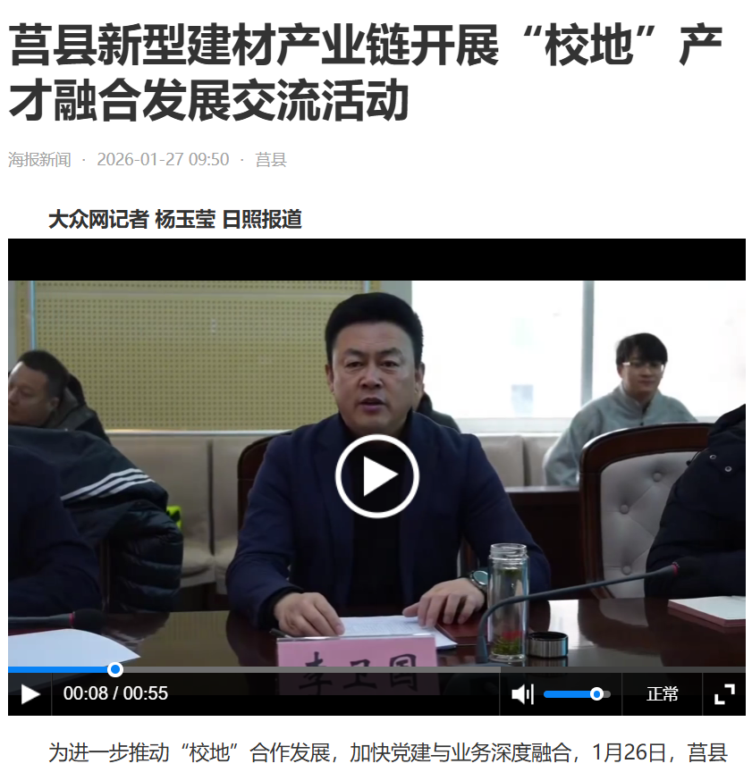 【编者按】1月30日,大众网、海报新闻、爱莒县报道了青岛农业大学建筑工程学院与莒县开展“校地”产才融合发展对接交流活动暨党建共建合作签约仪式,有效推进高质量助推企业与高校、科研院所产才融合发展,共同谱写校地合作、互利共赢的新篇章。