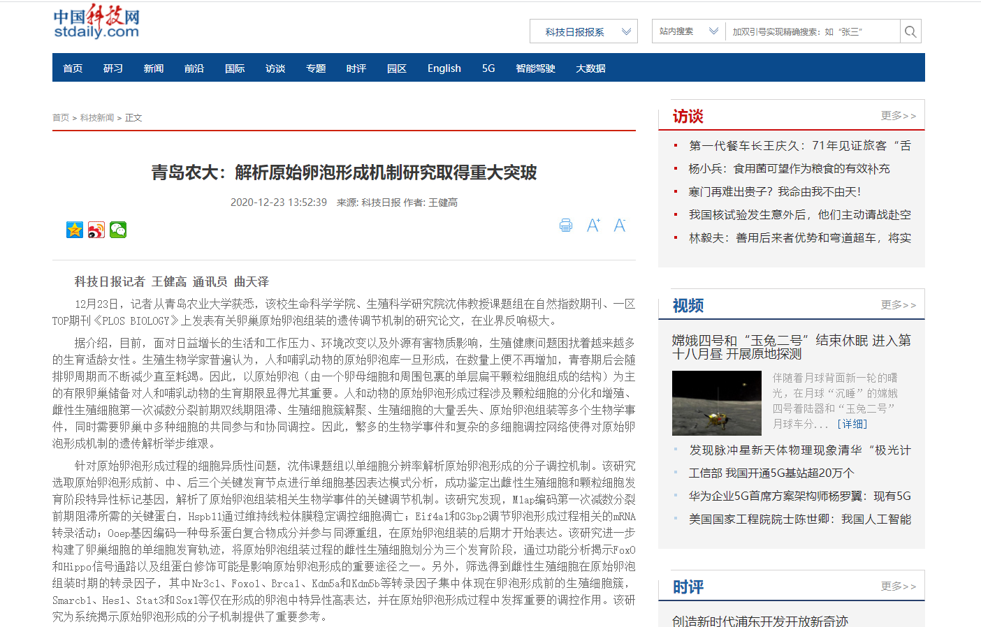 12月23日,记者从青岛农业大学获悉,该校生命科学学院、生殖科学研究院沈伟教授课题组在自然指数期刊、一区TOP期刊《PLOS BIOLOGY》上发表有关卵巢原始卵泡组装的遗传调节机制的研究论文,在业界反响极大。