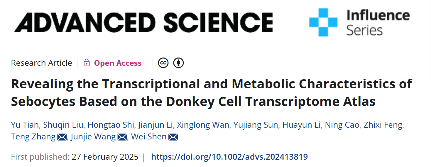 研究成果以“Revealing the transcriptional and metabolic characteristics of sebocytes based on the donkey cell transcriptome atlas”为题,在国际权威期刊《Advanced Science》上发表。该论文第一单位为青岛农业大学动物科技学院,内蒙古大学与青岛农业大学联合培养博士生田宇为第一作者,青岛农业大学动物科技学院沈伟教授、王俊杰教授和内蒙古大学生命科学学院张滕教授为共同通讯作者。该项目得到了农业农村部畜禽种质资源鉴定项目、山东省泰山学者工程和山东省驴产业技术体系等项目的资助,以及山东俊驰驴业有限公司、德州驴国家级保种场等单位的支持。