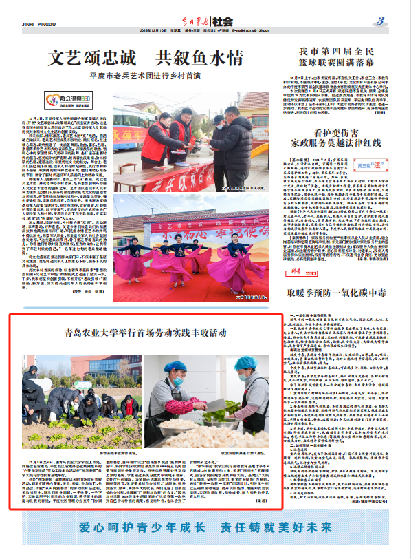 【编者按】12月10日,平度日报“今日平度|社会”以《青岛农业大学举行首场劳动实践丰收活动》为题报道了青岛农业大学在“秾华耕苑”教学实践与劳动教育基地举行“白菜佳享悦品”劳动实践丰收活动,引导学生树立正确的劳动观念,提升实践能力,增强知农爱农情怀,实现物质收获、精神成长、能力提升的多元育人目标。