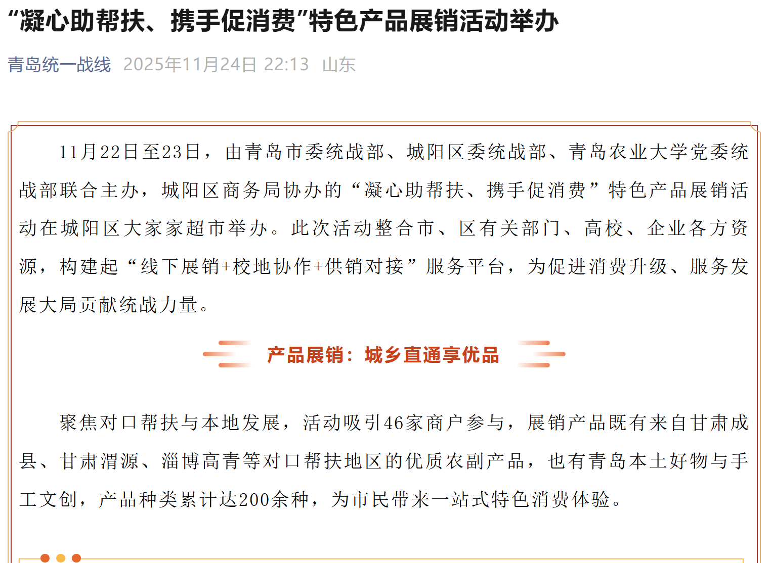 【编者按】11月24日,青岛统一战线以《“凝心助帮扶、携手促消费”特色产品展销活动举办》为题报道了青岛农业大学联合主办“凝心助帮扶、携手促消费”特色产品展销活动,构建起“线下展销+校地协作+供销对接”服务平台,为促进消费升级、服务发展大局贡献统战力量。