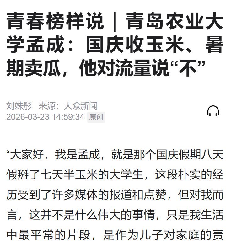 “大家好,我是孟成,就是那个国庆假期八天假掰了七天半玉米的大学生,这段朴实的经历受到了许多媒体的报道和点赞,但对我而言,这并不是什么伟大的事情,只是我生活中最平常的片段,是作为儿子对家庭的责任,更是刻在骨子里的朴素坚持。”——青岛农业大学计算机科学与技术专业2025级本科生孟成。
