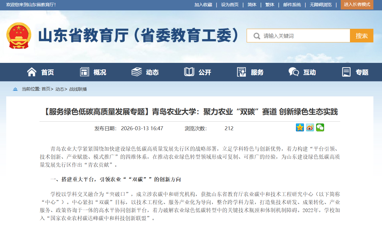 【编者按】近日,山东省教育厅战线联播栏目以《【服务绿色低碳高质量发展专题】青岛农业大学:聚力农业“双碳”赛道 创新绿色生态实践》为题,报道我校立足学科特色与创新优势,着力构建“平台引领、技术创新、产业赋能、模式推广”的四维体系,在推动农业绿色转型领域形成可复制、可推广的经验,为山东建设绿色低碳高质量发展先行区作出“青农贡献”。