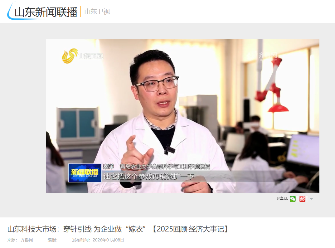 【编者按】1月8日,山东卫视“山东新闻联播”以《山东科技大市场:穿针引线 为企业做“嫁衣”【2025回顾·经济大事记】》为题,报道我校食品科技成果通过山东科技大市场平台为定西宽粉提供精准对接服务,助力突破产业技术瓶颈。