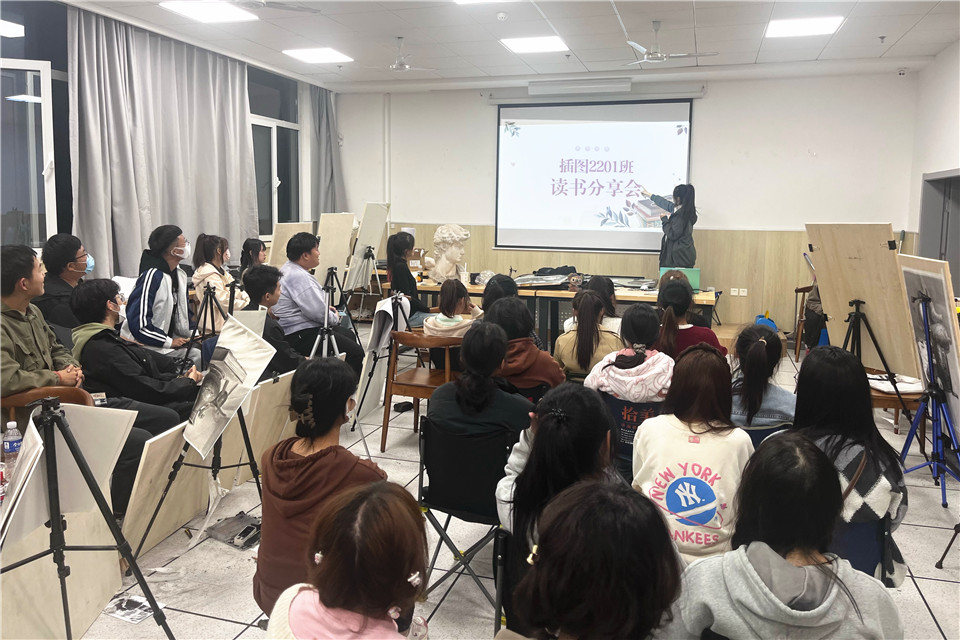 “读书不是为了读而读,而是要和自己的专业、生活结合起来,这样读书才有意义,才能真正发挥作用。”王磊老师深悉,要将阅读与专业深度融合,紧紧扣住专业特色,让学生们“读有所悟、悟有所创”,基于这个想法,他摸索出了一套“阅读+艺术”的特色模式,这也成了插图2201班读书会最大的亮点。
