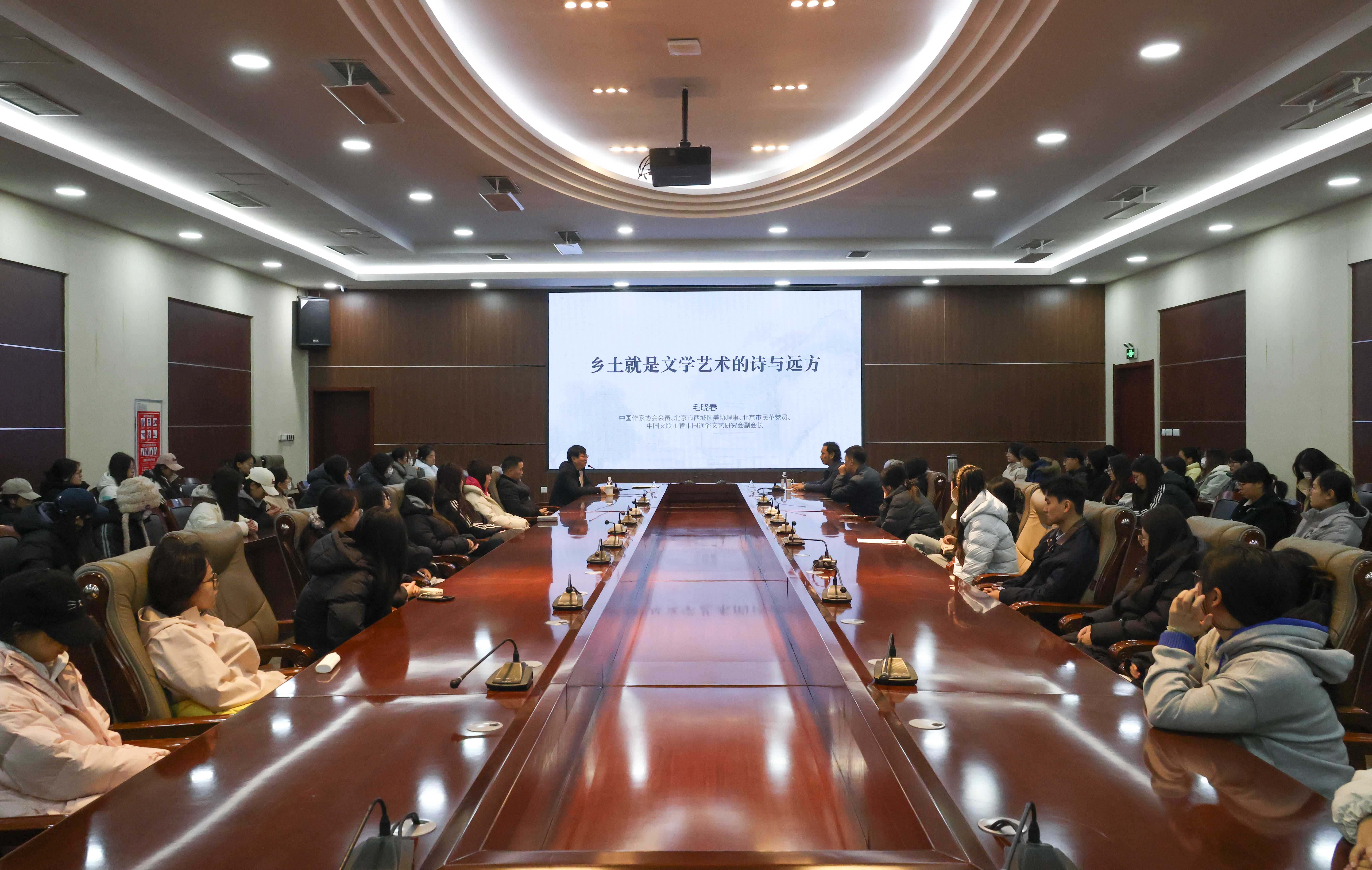 11月27日,青岛农业大学艺术学院在学术会馆会议厅举办“乡土文学艺术的诗与远方”的专题讲座。活动特邀中国作家协会会员、中国文联主管中国通俗文艺研究会副会长、金石书法家毛晓春先生担任主讲,艺术学院院长李慧斌主持报告会,艺术学院和人文学院师生代表参加学习。