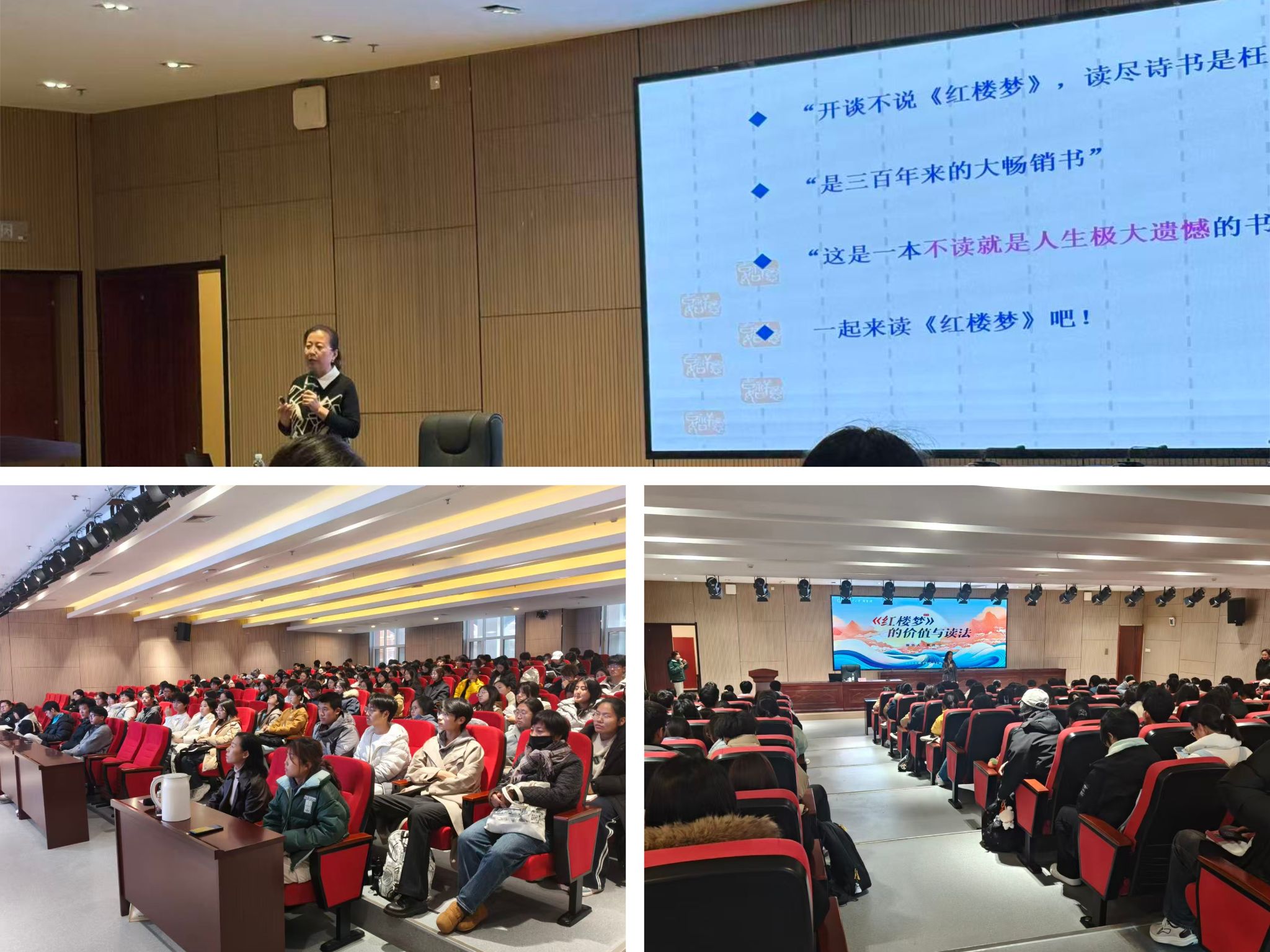 蔡连卫副教授以详实的史料、风趣的语言,系统梳理了《红楼梦》跨越三个世纪的阅读史、接受史与研究史,深入阐释了《红楼梦》对当代青年的全方位知识获取、爱情友情的情感镜鉴以及语言艺术和处世智慧方面的指导意义和价值。同时从初读要“不求甚解”,细读需“熟读精思”,再读则“看见人生”,跟大学生分享了自己的阅读体验,并推荐了阅读书单和读书方法。