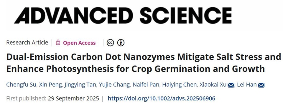 近日,青岛农业大学农学院博导韩磊教授团队在盐碱地作物抗逆与生长促进研究方面取得新进展,通过合成一种新型碳点纳米酶,在不依赖基因改造和有机农药的前提下,直接提升作物耐盐碱性。相关研究成果发表于国际SCI期刊《Advanced Science》(中国科学院1区TOP期刊,影响因子14.1)。该论文以青岛农业大学农学院为第一通讯单位,农学院教师苏成付副教授、农学院硕士研究生彭欣、化药学院硕士研究生谭婧盈为共同第一作者,农学院博士生导师、化药学院生物纳米与分子识别团队及国创中心纳米农业工程团队负责人韩磊教授为第一通讯作者,团队许晓凯教授为共同通讯作者。