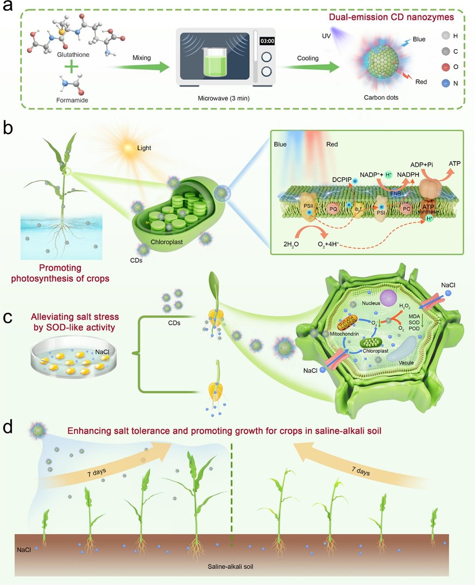 针对这一挑战,韩磊教授团队创新性地设计并制备了一种具有“光合增强”与“抗氧化”双功能协同的碳点纳米酶,其独特之处在于同时具备了与叶绿体吸收光谱精准匹配的双发射荧光特性,以及模拟天然超氧化物歧化酶的抗氧化活性:一方面,碳点发出的蓝光与红光,能够被叶绿体高效捕获,如同为光合作用系统“补充特定光谱”,从而显著提升光能转换与电子传递效率;另一方面,其类酶活性可以高效清除盐胁迫下过量产生的活性氧,直接减轻氧化损伤,避免作物消耗过多能量用于应急防御,从而将更多资源用于生长。