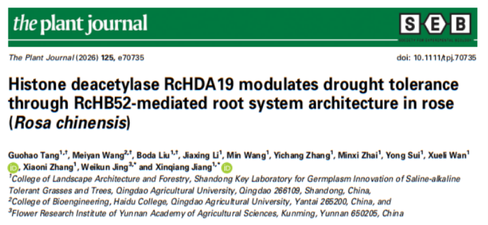 园林与林学院2023级硕士研究生唐国浩、海都学院王美艳讲师以及2022级已毕业研究生刘博达(现为北京林业大学博士研究生在读)为论文共同第一作者。姜新强教授与云南省农业科学院花卉研究所景维坤研究员为共同通讯作者。此外,青岛农业大学万雪丽副教授、张晓妮副教授也参与了本工作。本研究得到国家自然科学基金((32572114、32371941)、山东省重点研发计划项目(2025LZGC031、 2025CXPT149)、山东省自然科学基金项目(ZR2023MC014、ZR2025MS336)和青岛农业大学研究生创新项目(QNYCX24026)的资助。