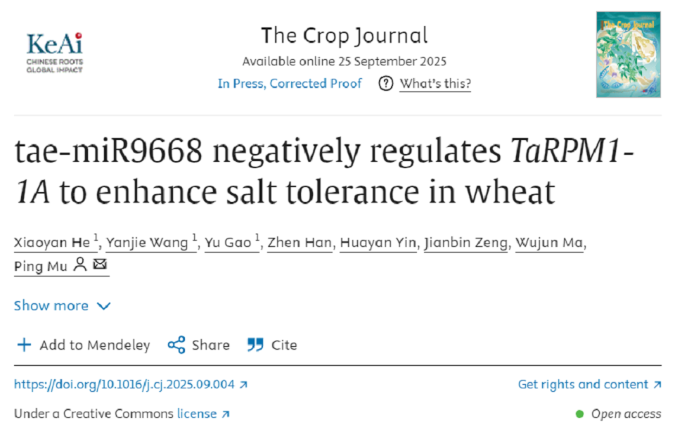近日,青岛农业大学穆平教授课题组在The Crop Journal(中国科学院1区TOP期刊,影响因子5.6)上,在线发表了题为“tae-miR9668 negatively regulates TaRPM1-1A to enhance salt tolerance in wheat”的研究论文。该研究系统解析了tae-miR9668–TaRPM1-1A模块在小麦耐盐中的调控作用,并进一步发现TaRPM1-1A与TaSnRK1.3-D的互作关系,为小麦耐盐分子育种提供了新靶点。