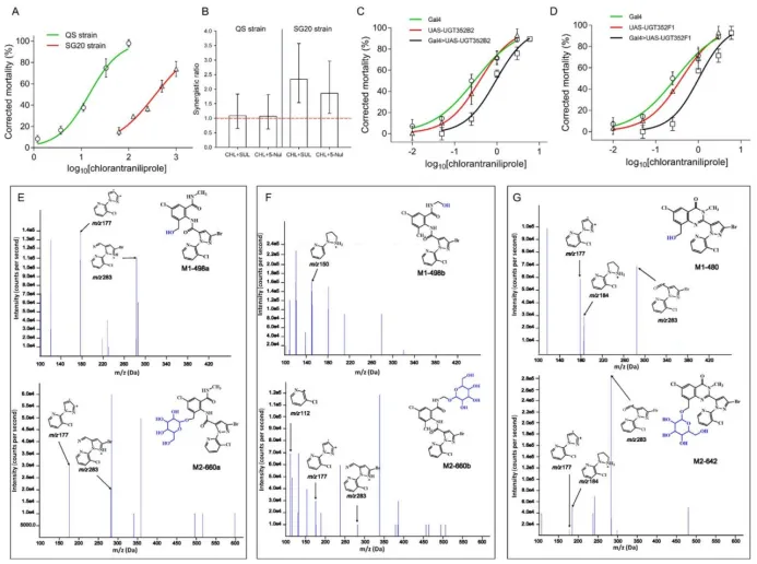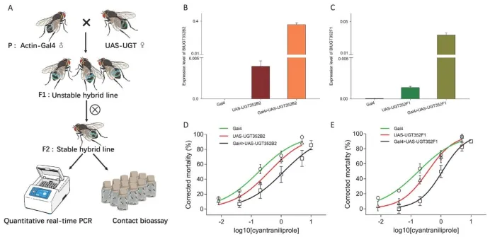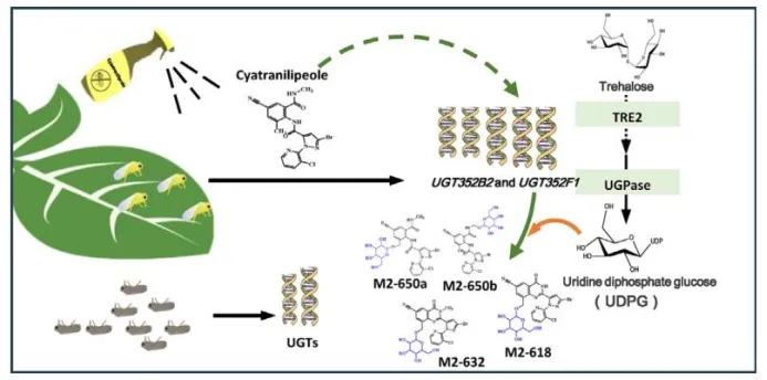 研究团队通过毒力测定、酶学分析、基因功能验证和代谢产物鉴定等方法,深入研究了UGTs在烟粉虱抗性中的作用。结果表明,烟粉虱的抗性主要来源于UGT酶的上调表达,而非底物亲和力的变化。两个关键基因(BtUGT352B2和BtUGT352F1)在抗性中发挥重要作用。此外,研究还表明UDP-葡萄糖合成途径参与该抗性过程,溴氰虫酰胺的羟基代谢物及糖苷代谢也在昆虫中被初步鉴定。进一步的研究发现,UGTs还在烟粉虱对邻甲酰胺基苯甲酰胺类杀虫剂的交互抗性中发挥关键作用。