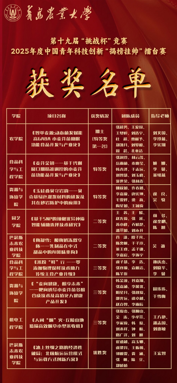 近日,由共青团中央、中国科协、教育部、中国社会科学院、全国学联共同主办的第十九届“挑战杯”竞赛2025年度中国青年科技创新“揭榜挂帅”擂台赛种业科技创新领域、新材料领域和生物医药领域主擂台分别在三亚市、龙岩市和呼和浩特市举行,青岛农大推荐项目斩获特等奖3项,其中擂主1项(特等奖第一名),二等奖2项、三等奖3项、优胜奖1项,在获奖质量、数量上均取得历史突破。