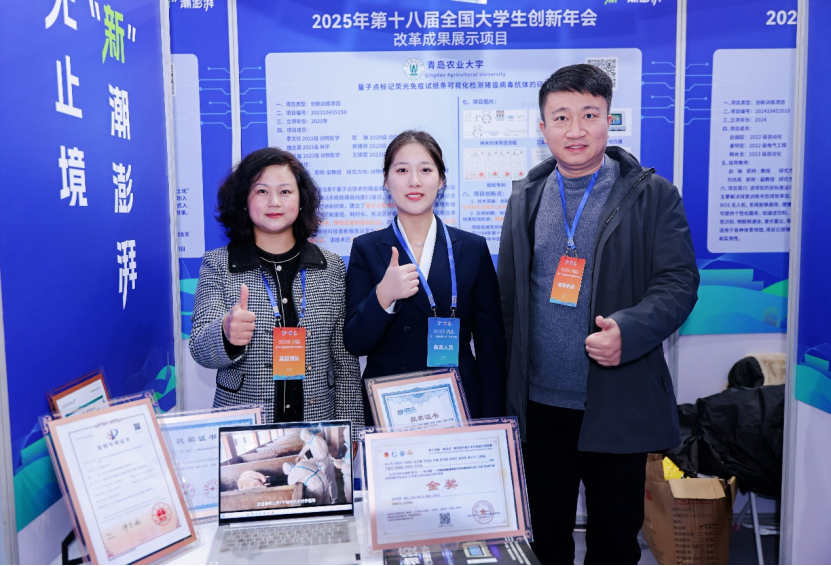 入选项目由动物医学院曹志副教授指导,2021级动物医学专业本科生李文玲作为项目负责人参加年会展示与交流。该项目聚焦重大动物疫病防控检测,针对传统猪瘟检测“难区分、低灵敏、长耗时”的痛点,融合纳米抗体的高特异性与量子点的高灵敏度优势,研发出新型检测试纸条。该试纸条可精准区分猪瘟疫苗免疫与自然感染,检测灵敏度达到0.1pg/mL,较传统胶体金检测方法提升1000倍,3分钟即可出结果且支持定量分析,实现“快、准、灵”三重突破。项目已授权国家专利4项、发表SCI论文1篇、获得“挑战杯”国家级金奖和中国国际大学生创新大赛国家级银奖等荣誉。经科技查新报告认定,该技术达到国内领先水平,检测结果已获第三方检测机构权威认证。项目成果有望为猪瘟病毒净化提供高效检测工具,为国家无疫区建设与畜禽产业健康发展提供关键技术支撑。