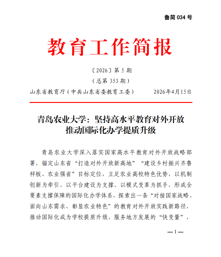 近日,山东省教育厅《教育工作简报》(2026年第5期)刊发《青岛农业大学:坚持高水平教育对外开放 推动国际化办学提质增效》,对学校相关典型经验做法进行报道。