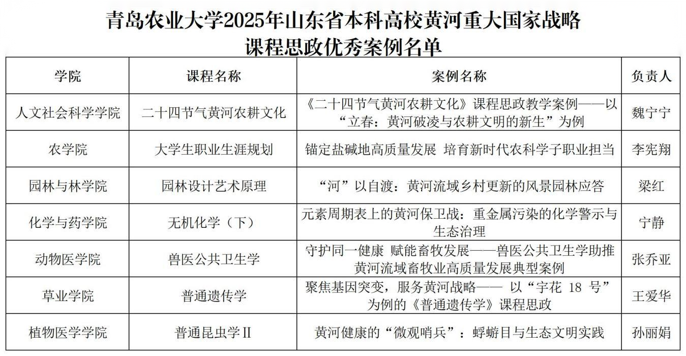 近日,山东省高等学校课程思政研究中心公布2025年山东省本科高校黄河重大国家战略课程思政优秀案例名单。青岛农业大学共有7个案例成功入选,彰显了学校在推动课程思政与黄河战略深度融合方面的扎实工作和显著成效。