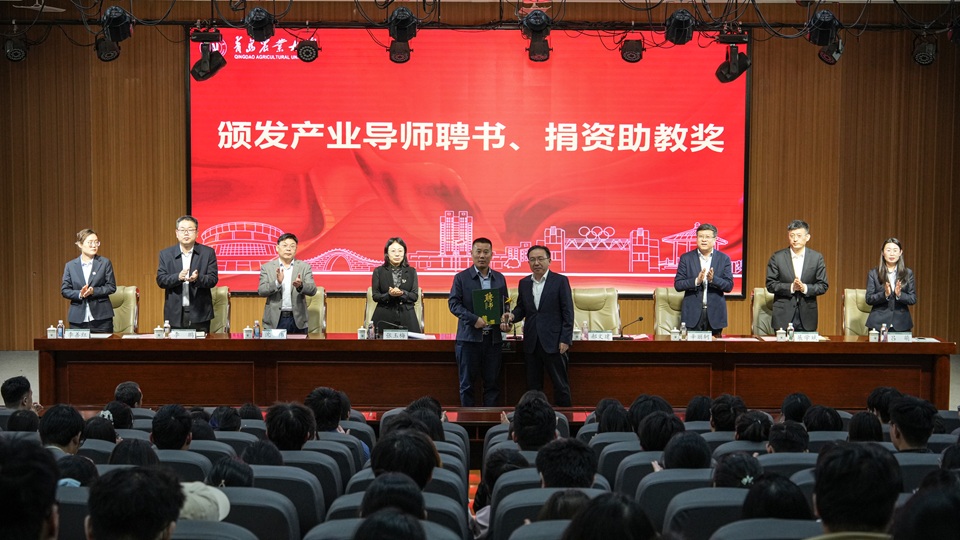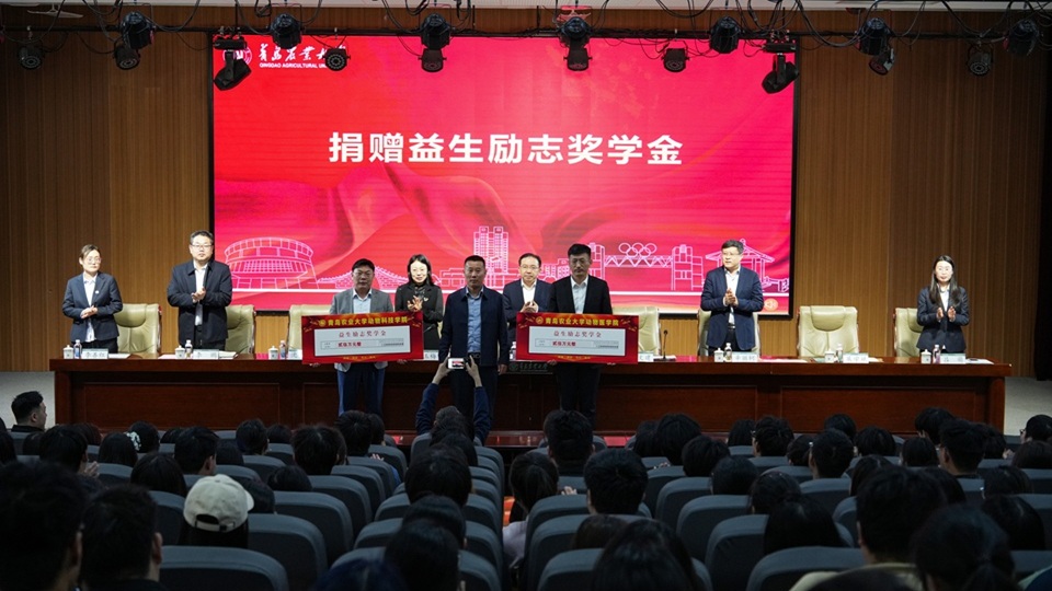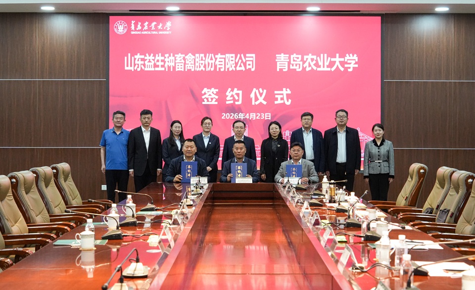 2026年4月23日下午,青岛农业大学“益生励志奖学金”签约及颁奖仪式在学术会馆举行。校党委副书记、校长赵金山出席并致辞,山东益生种畜禽股份有限公司常务副总裁郝文建参加,仪式由校党委委员、副校长张玉梅主持。