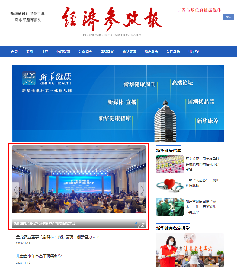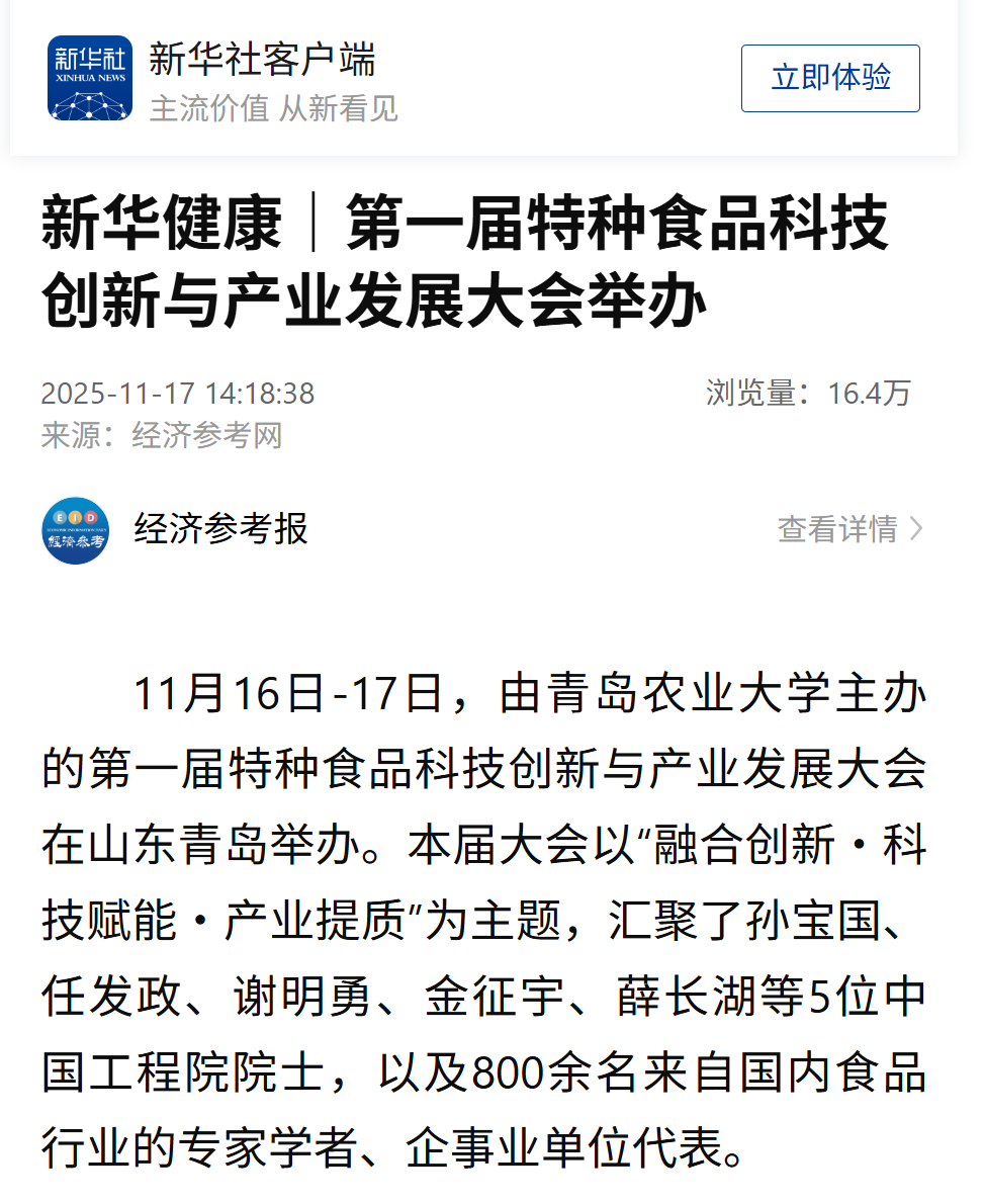 11月17日至19日,新华社《经济参考报》、经济参考网、客户端以《科创融合驱动特种食品产业加速发展》等为题,报道青岛农业大学主办的第一届特种食品科技创新与产业发展大会的情况。其中,11月19日出版的《经济参考报》在报纸版面和网站首页进行了重点关注,聚焦“深耕‘药食同源’促千年智慧与现代科技融合”“深挖海洋资源 未来食品有望成为新增长极”“协同创新 构建‘一体化’产业生态”等三个方面,通过对大会召开情况和与会院士专家观点、产业行业需求等的系统梳理,重点报道了我国特种食品产业发展、创新成果和未来展望。此外,中国科技网、山东三农新闻联播、大众日报、农村大众、青岛日报、青岛电视台等多家媒体均对大会进行了报道(详见新闻网媒体农大栏目)。