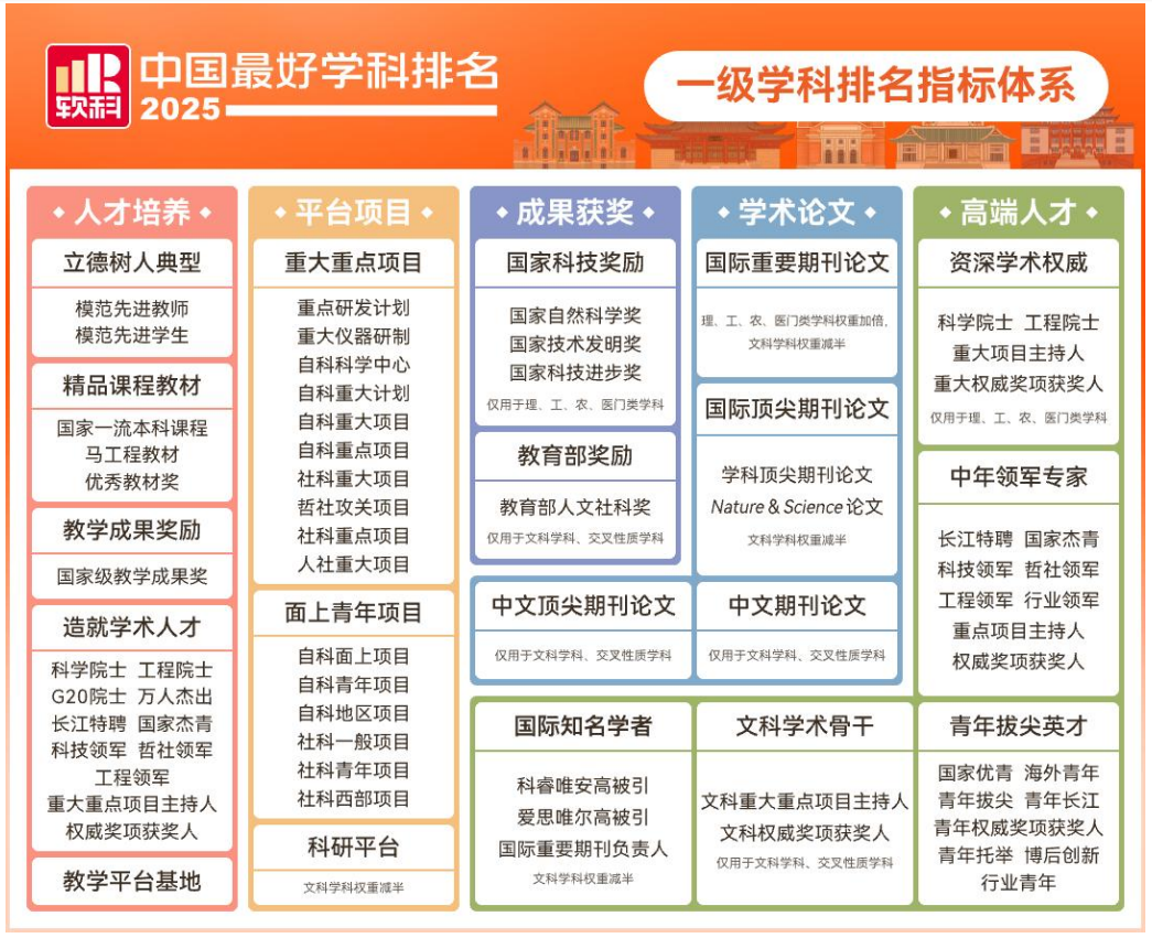 软科中国最好学科排名(一级学科)指标体系包括人才培养、平台项目、成果获奖、学术论文、高端人才5个指标类别,下设19个指标,共计200多项反映学科竞争力的观测变量。今年指标体系的变化包括:新增教学平台基地指标,包含国家级虚拟仿真实验教学中心和国家级实验教学示范中心;在科研平台指标下新增“一带一路”联合实验室以及水利部、住房和城乡建设部、交通运输部等部委的科研创新平台。