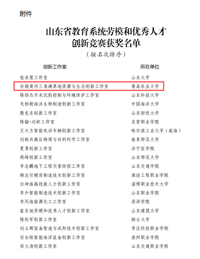 近日,在山东省教育工会委员会组织的“鲁新杯”山东省教育系统劳模和优秀人才创新竞赛活动中,学校“孙娟黄河三角洲草地资源与生态创新工作室”以第二名成绩获奖,并获1万元创新资助资金。全省共有20个工作室获奖。