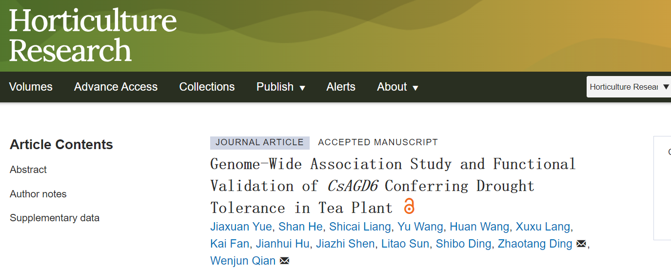 近日,园艺学院茶树育种团队在《Horticulture Research》上发表了题为“Genome-Wide Association Study and Functional Validation of CsAGD6 Conferring Drought Tolerance in Tea Plant”的研究论文。该研究系统开展了茶树抗旱性的全基因组关联分析(GWAS),成功鉴定并功能验证了关键抗旱基因CsAGD6,发掘了其优良单倍型,并开发出可用于分子育种的KASP标记,为茶树抗旱机制解析与品种选育提供了理论依据和实用工具。