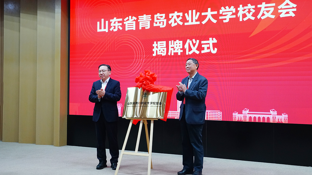 校党委副书记、校长赵金山与兽医1977级校友、青岛康地恩实业有限公司董事长、青岛蔚蓝生物股份有限公司董事张效成,共同为“山东省青岛农业大学校友会”揭牌。