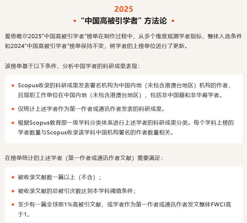 据悉,2025“中国高被引学者”上榜共计6310人,来自543所高校、企业及科研机构,覆盖了教育部10个学科领、83个一级学科。榜单以全球领先的信息分析公司爱思唯尔(Elsevier)的引文与索引数据库Scopus作为统计来源,采用了上海软科教育信息咨询有限公司开发的方法。