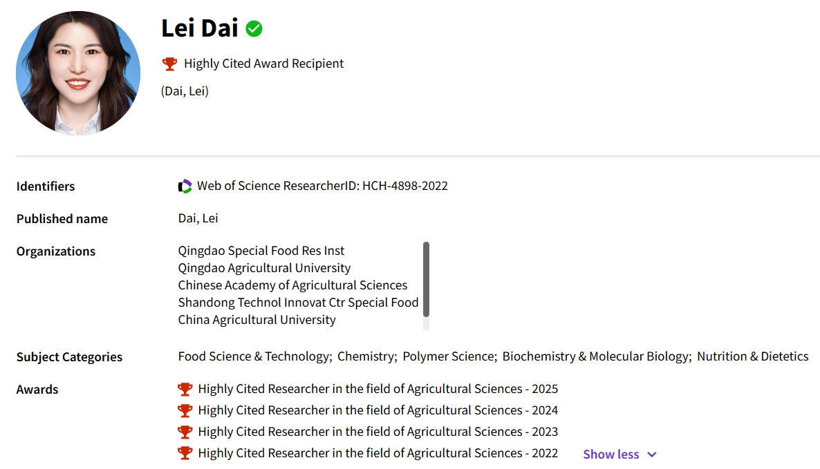 11月12日,科睿唯安(Clarivate)发布了2025年度“全球高被引科学家”(Highly Cited Researchers)名单,青岛农业大学食品科学与工程学院代蕾教授入选,学科领域为农业科学。这是代蕾教授自2022年以来连续四次入选该榜单。