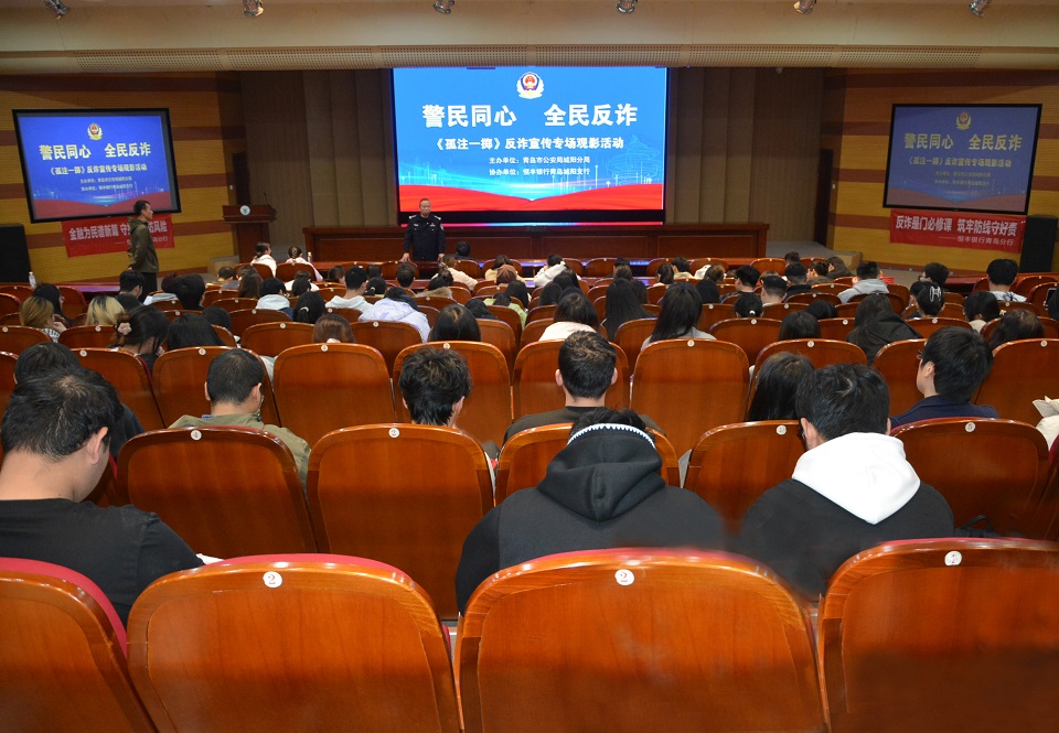 为进一步提高师生反诈防骗能力,增强防范意识。11月6日下午,保卫处联合青岛市公安局城阳分局、恒丰银行青岛城阳支行联合开展“警民同心 全民反诈”主题观影活动。农学院、动物医学院、理学与信息科学学院师生代表集中观看反诈教育影片《孤注一掷》。