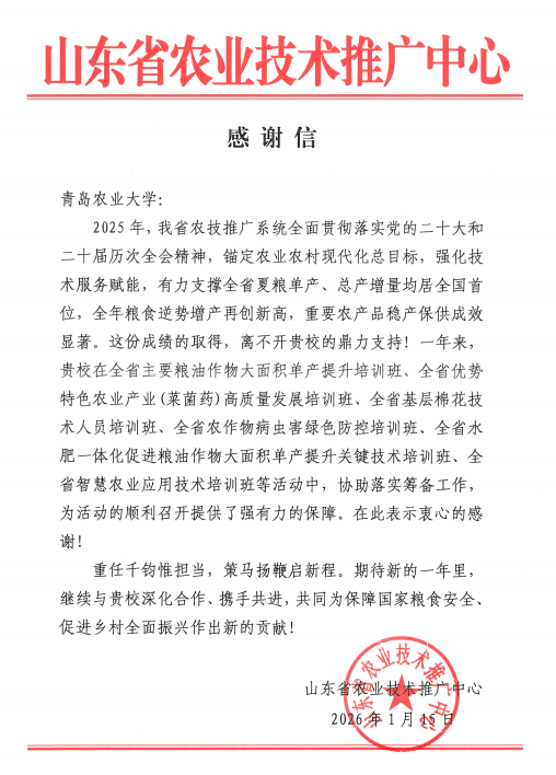 1月15日,山东省农业技术推广中心向我校发来感谢信,对我校在2025年全省基层农技人员培训工作中协助落实筹备工作,为活动的顺利进行提供了强有力的保障表示衷心感谢。信中指出,在全省夏粮单产、总产增量均居全国首位,全年粮食逆势增产再创新高的亮眼成绩背后,凝聚着青岛农业大学在农业人才培养与技术推广领域的辛勤付出与重要贡献。这份认可是对学校过去一年中高质量承办2025年全省基层农技人员培训项目的肯定。