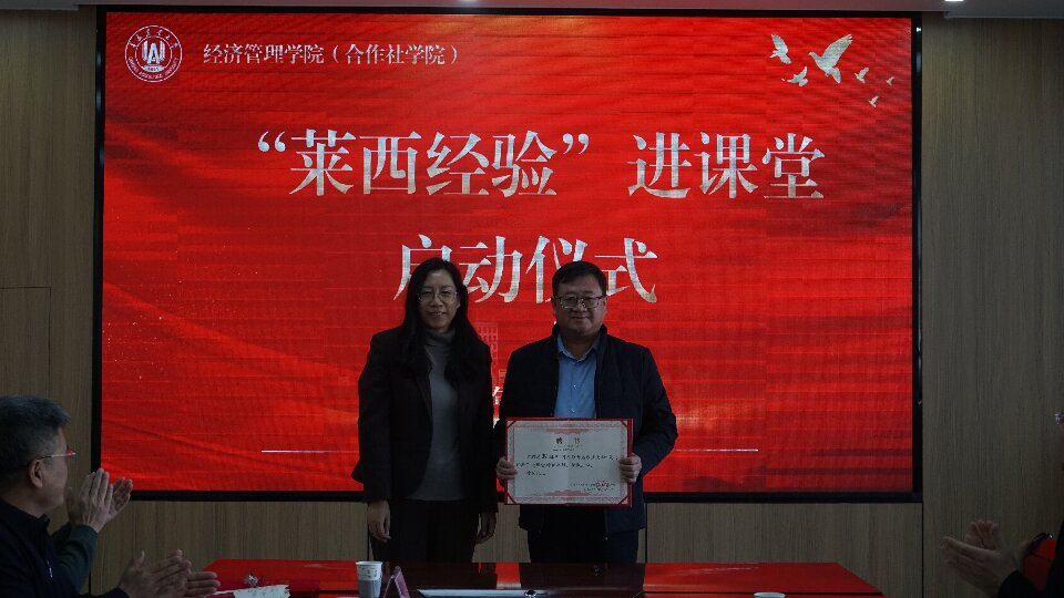 12月26日上午,青岛农业大学经济管理学院(合作社学院)与中共莱西市委党校(青岛农村基层党建学院)“莱西经验”进课堂启动仪式在文经楼A420举行。莱西市委党校副校长、市行政学校校长耿旭日,校务委员会委员、教务处主任崔帅,理论部主任于上钧,青岛农业大学教务处副处长周春玲参加仪式。仪式由经济管理学院(合作社学院)党委书记张德锋主持。