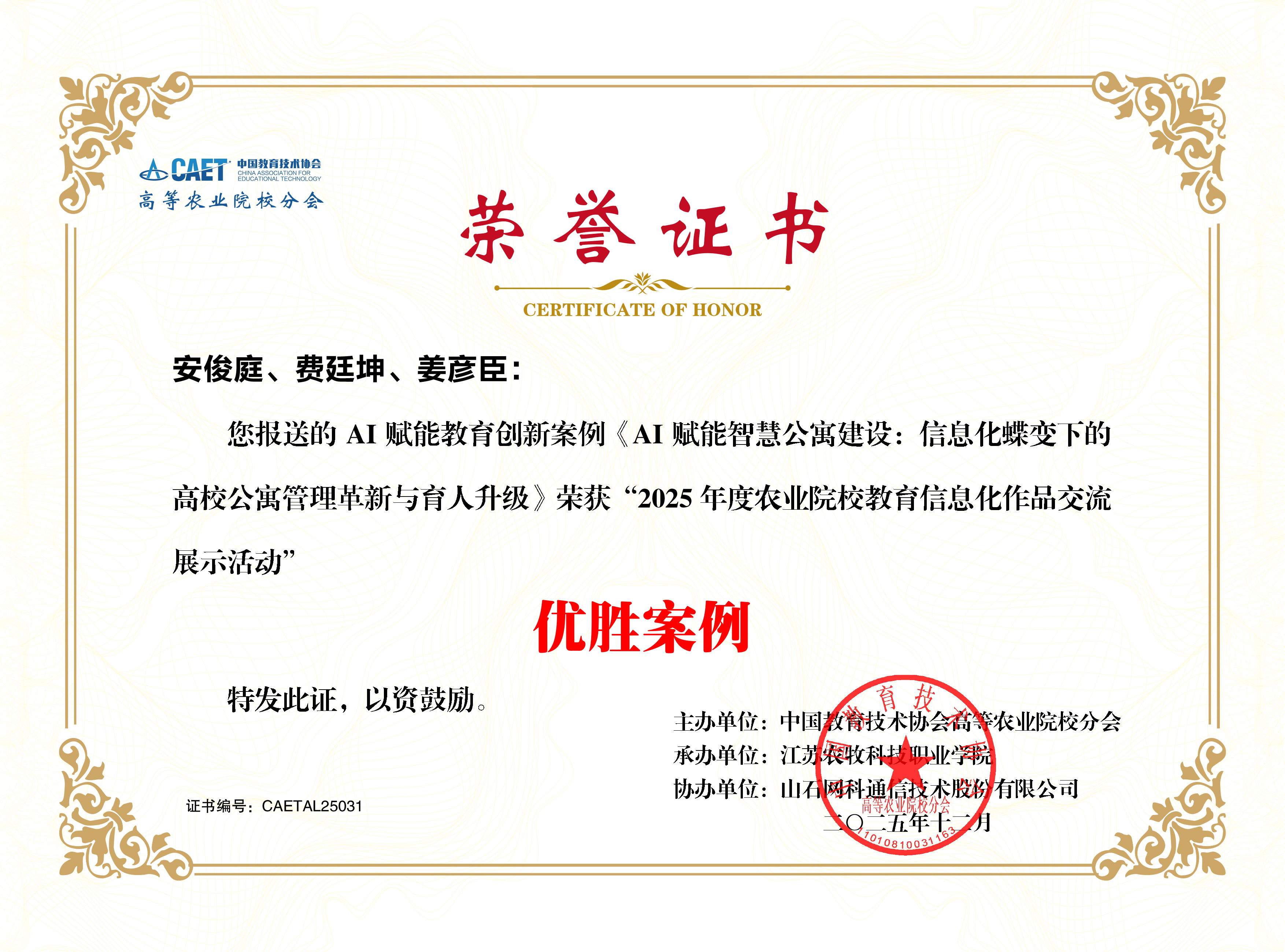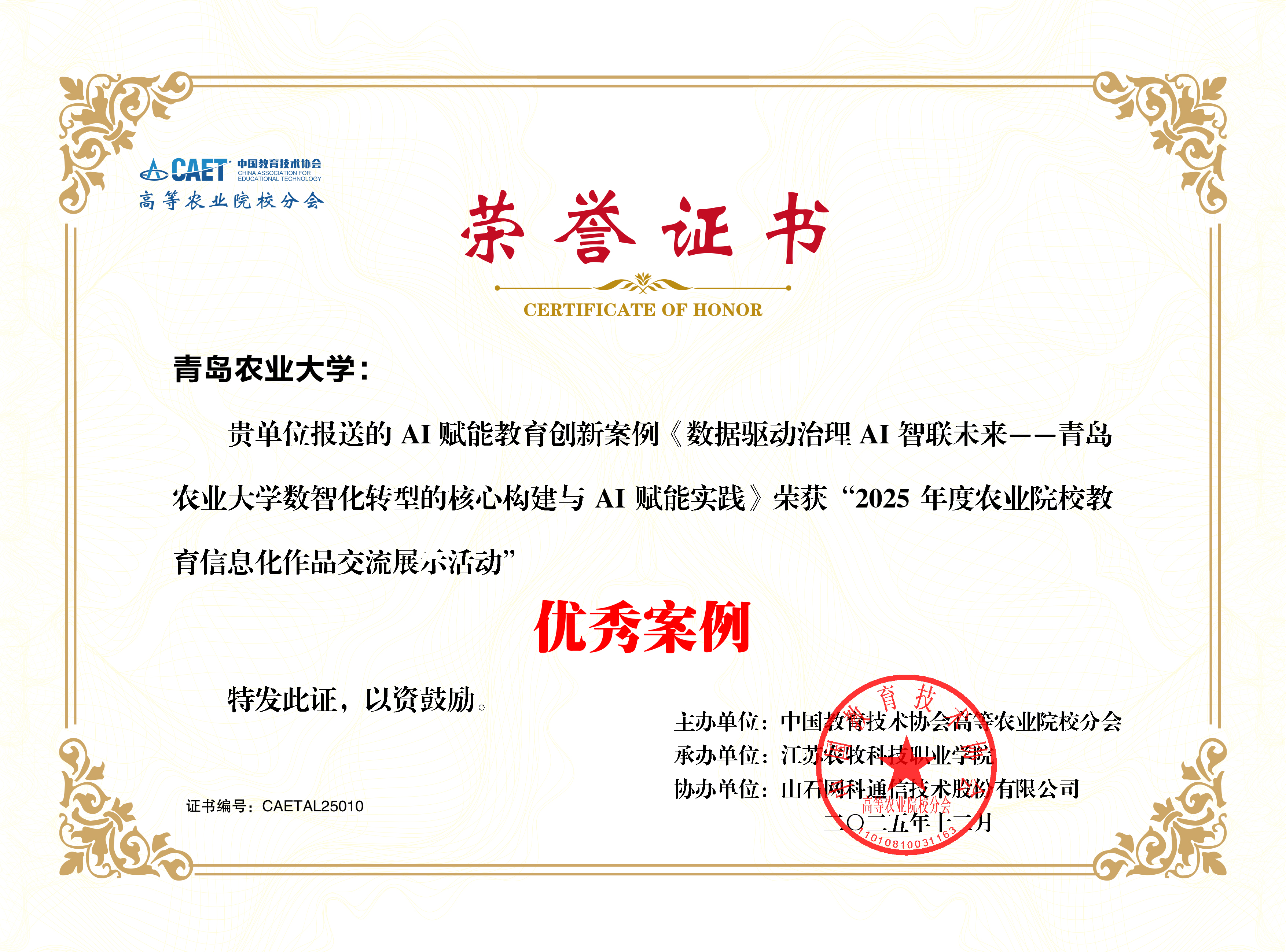 近日,中国教育技术协会高等农业院校分会公布2025年高等农业院校系列优秀评选结果,我校获评“教育信息化建设先进集体”,学校教师黄国富荣获“教育信息化建设先进工作者”称号,《数据驱动治理 AI智联未来-青岛农业大学数智化转型的核心构建与AI赋能实践》获评AI赋能教育创新优秀案例,《AI赋能智慧公寓建设:信息化蝶变下的高校公寓管理革新与育人升级》获评AI赋能教育创新优胜案例。