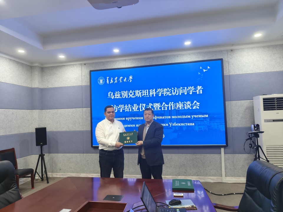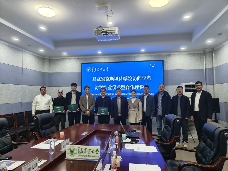 会上,王永健代表学校对5位乌兹别克斯坦科学院青年科学家在青岛农业大学圆满完成历时五个月的访学工作表示祝贺,并向各位访问学者颁发结业证书。王永健指出,乌兹别克斯坦科学院遗传学与植物实验生物学研究所是我校长期可靠的合作伙伴,双方在科学研究、平台建设、人员培训等方面一直保持高效的交流互动,也取得了一系列具有代表性的成果和案例,并期望乌兹别克斯坦科学院的青年科学家们回到祖国,继续发挥桥梁纽带作用,进一步推动双方的务实合作。乌兹别克斯坦科学院访问学者们对青岛农业大学的科研指导和悉心帮助表示感谢。